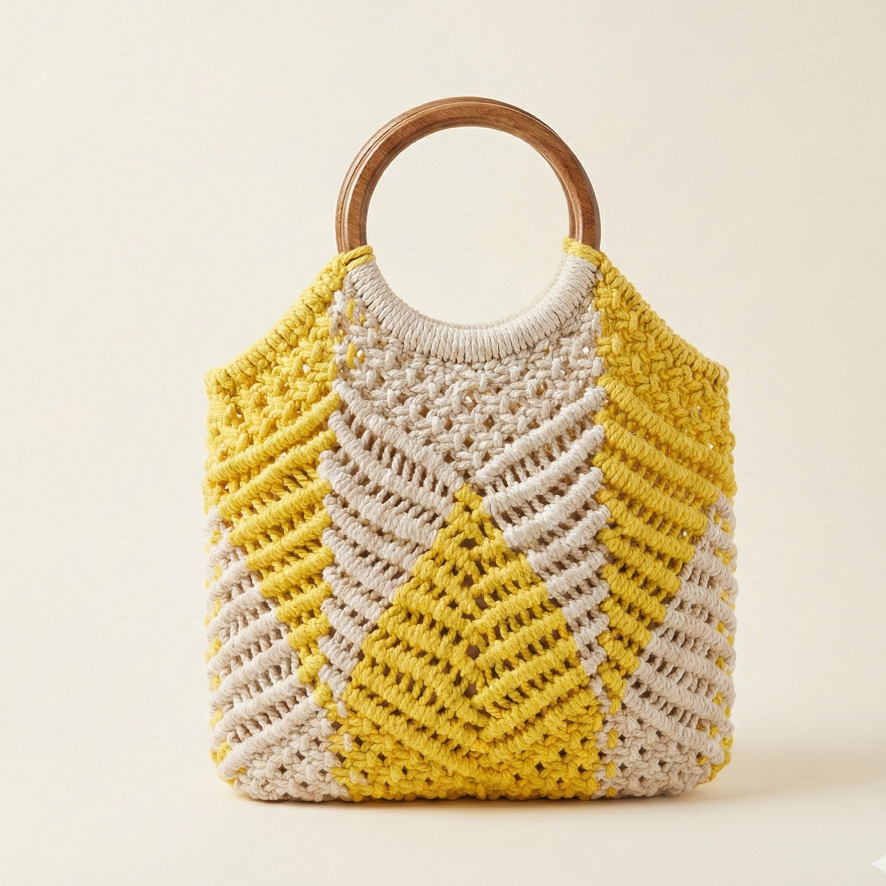 Crafted in a contemporary knit pattern with a structured silhouette, this bag blends soft mustard tones with neutral ivory for a fresh, elevated look. The smooth wooden handle adds a premium touch, making it perfect for brunch dates, casual outings, vacations, or everyday city wear.